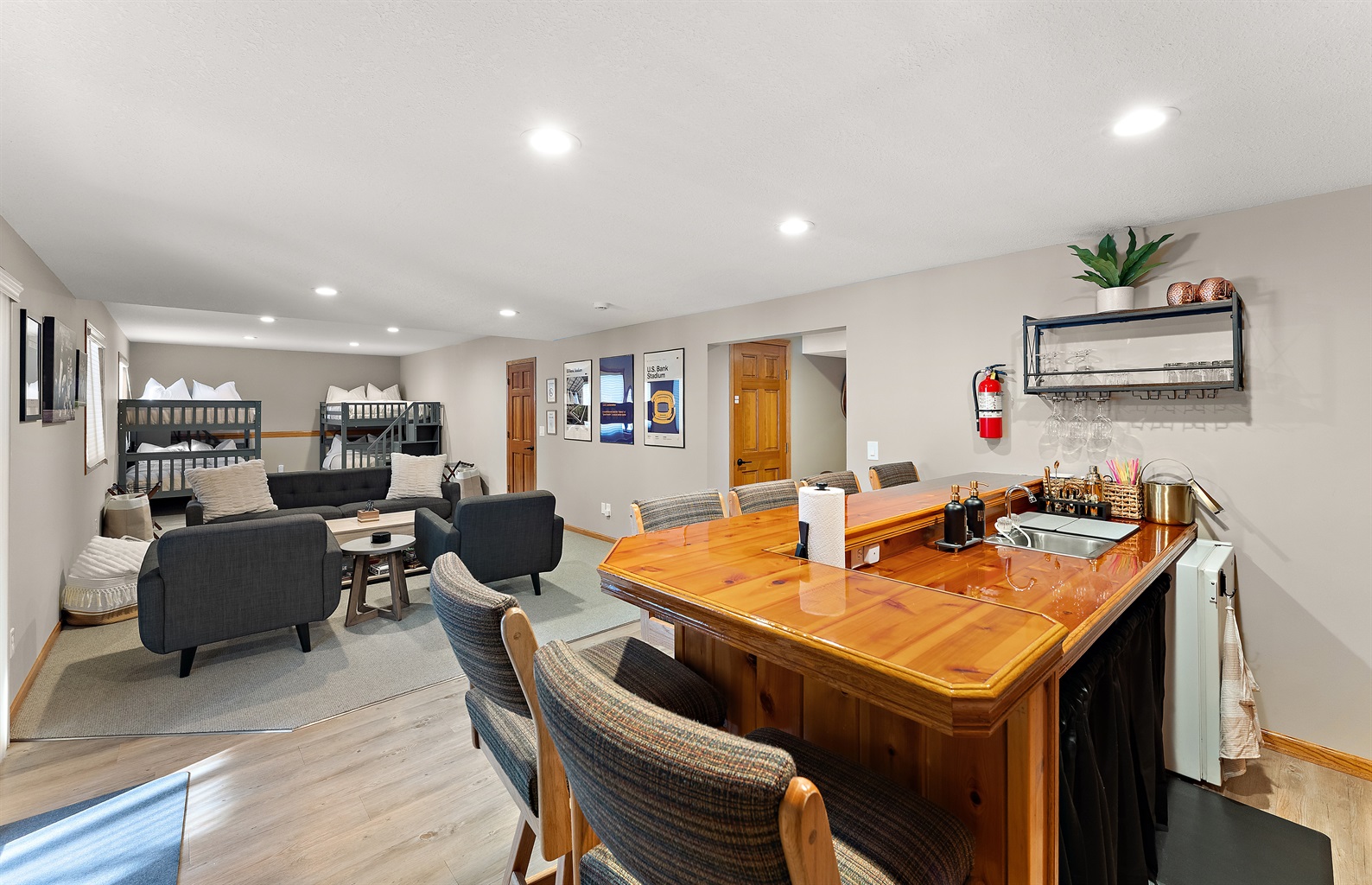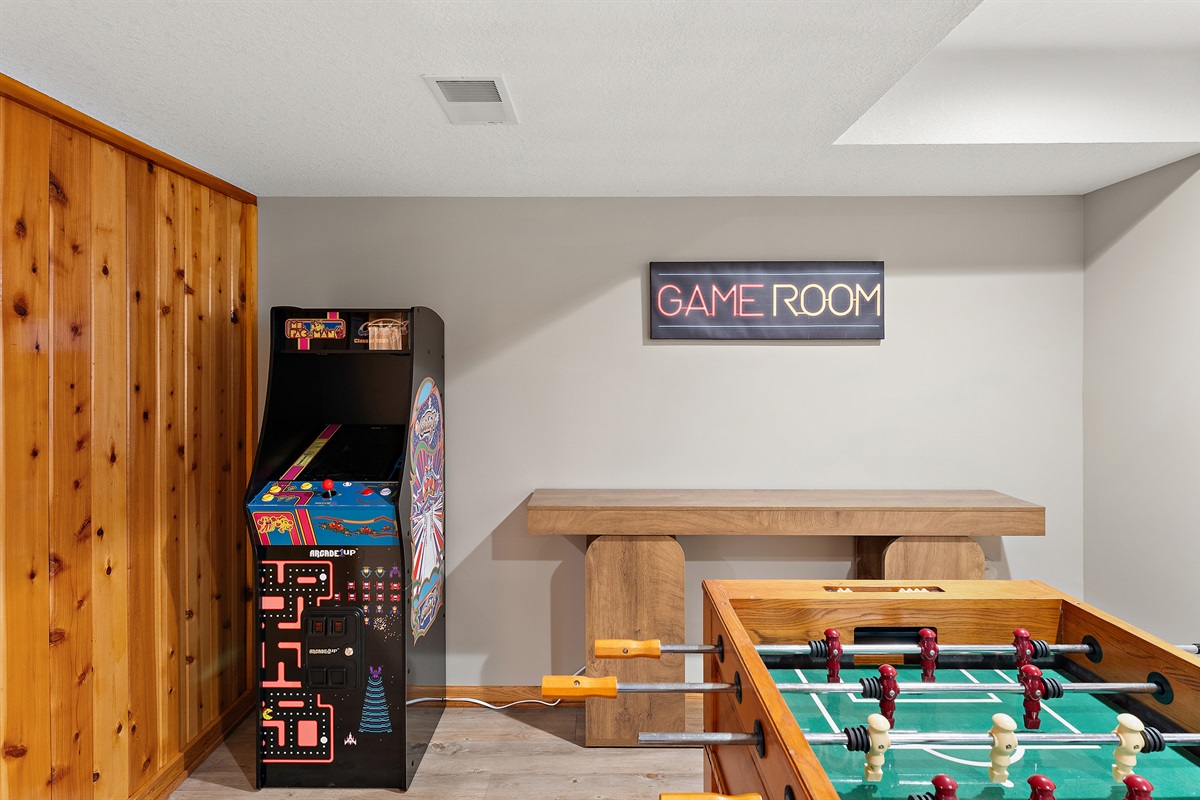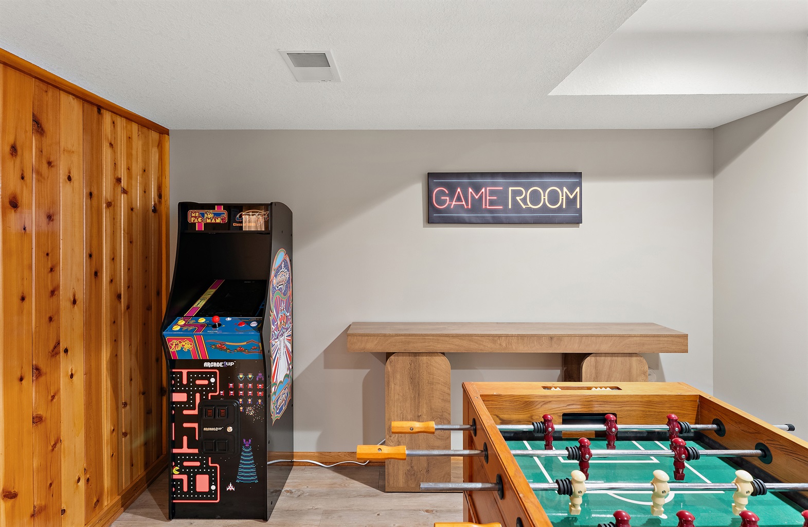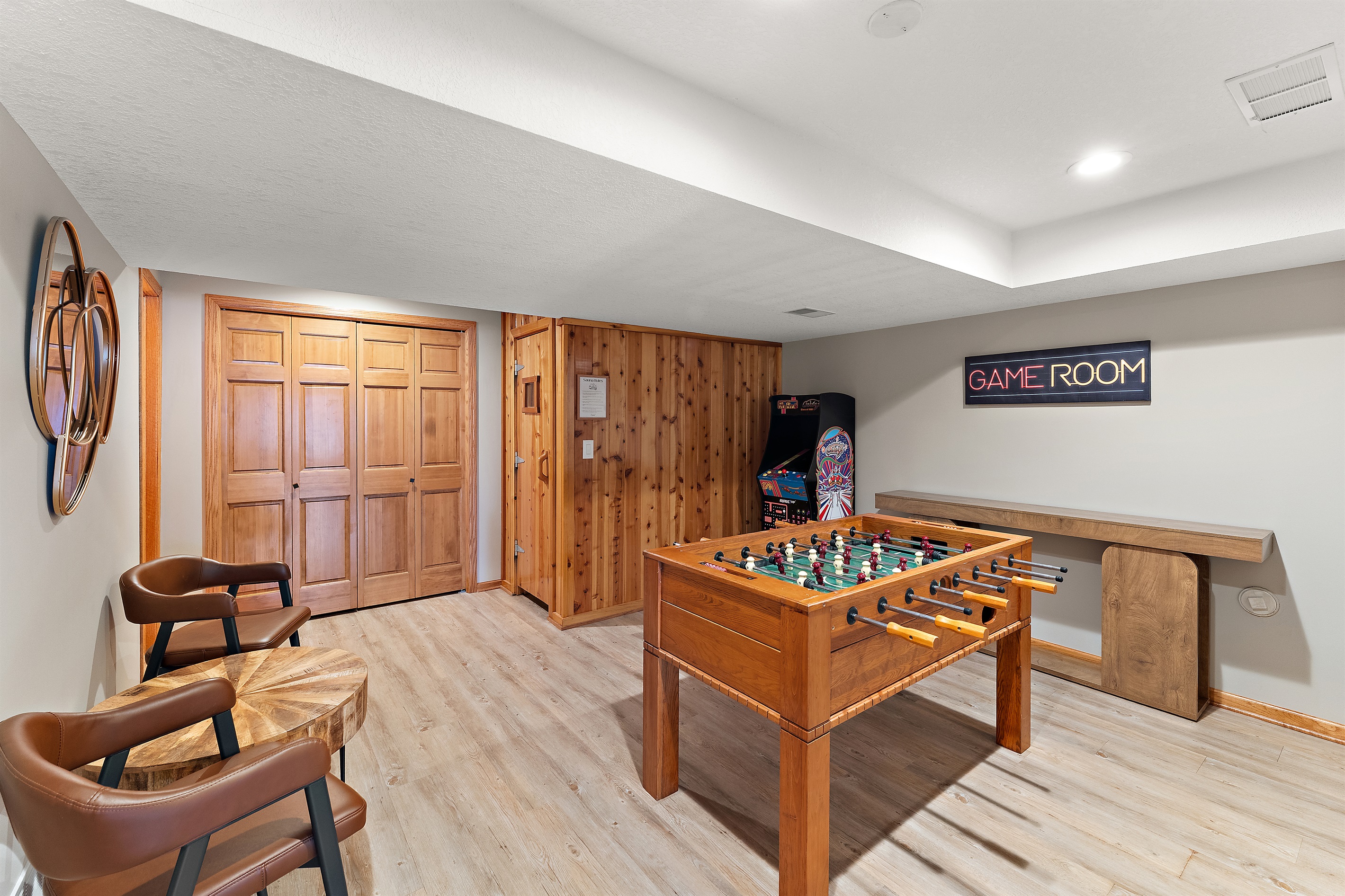 Sleeps up to 14 with room to spread out and relax. The entertainment basement is a highlight, featuring two 75″ TVs, arcade machine, foosball, sauna, and a private hot tub.