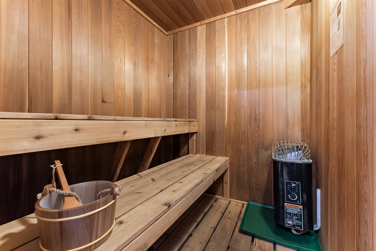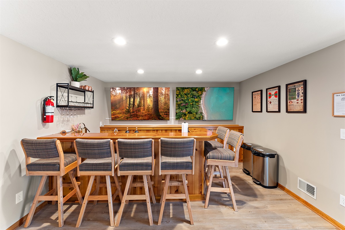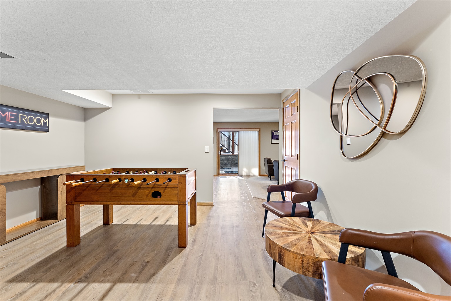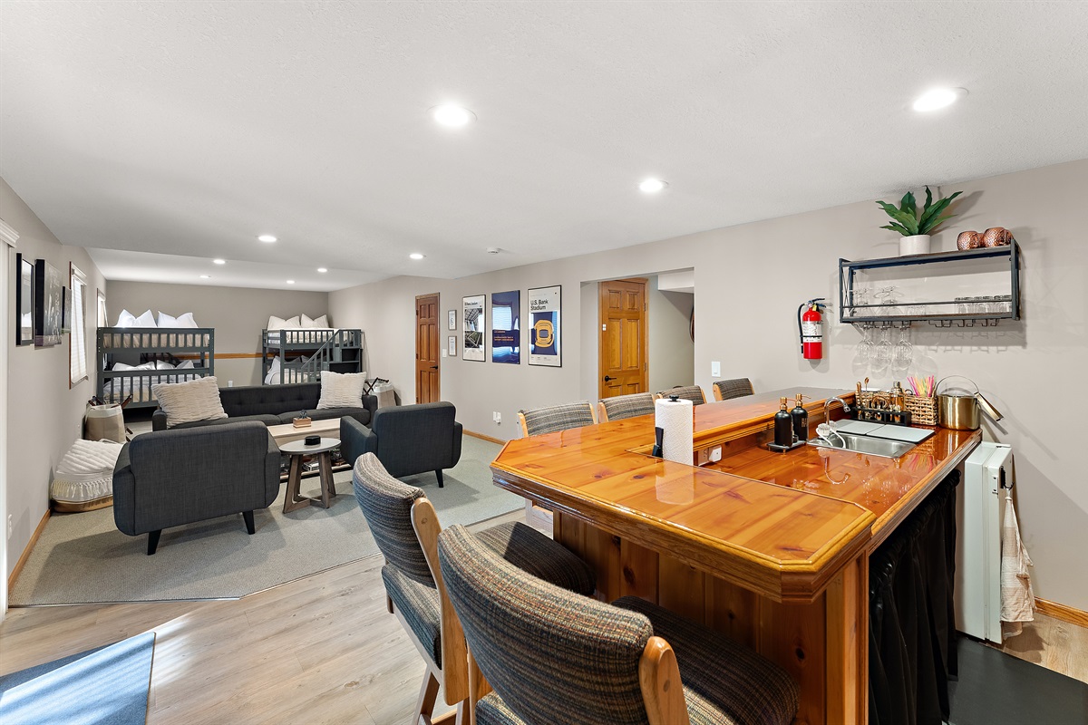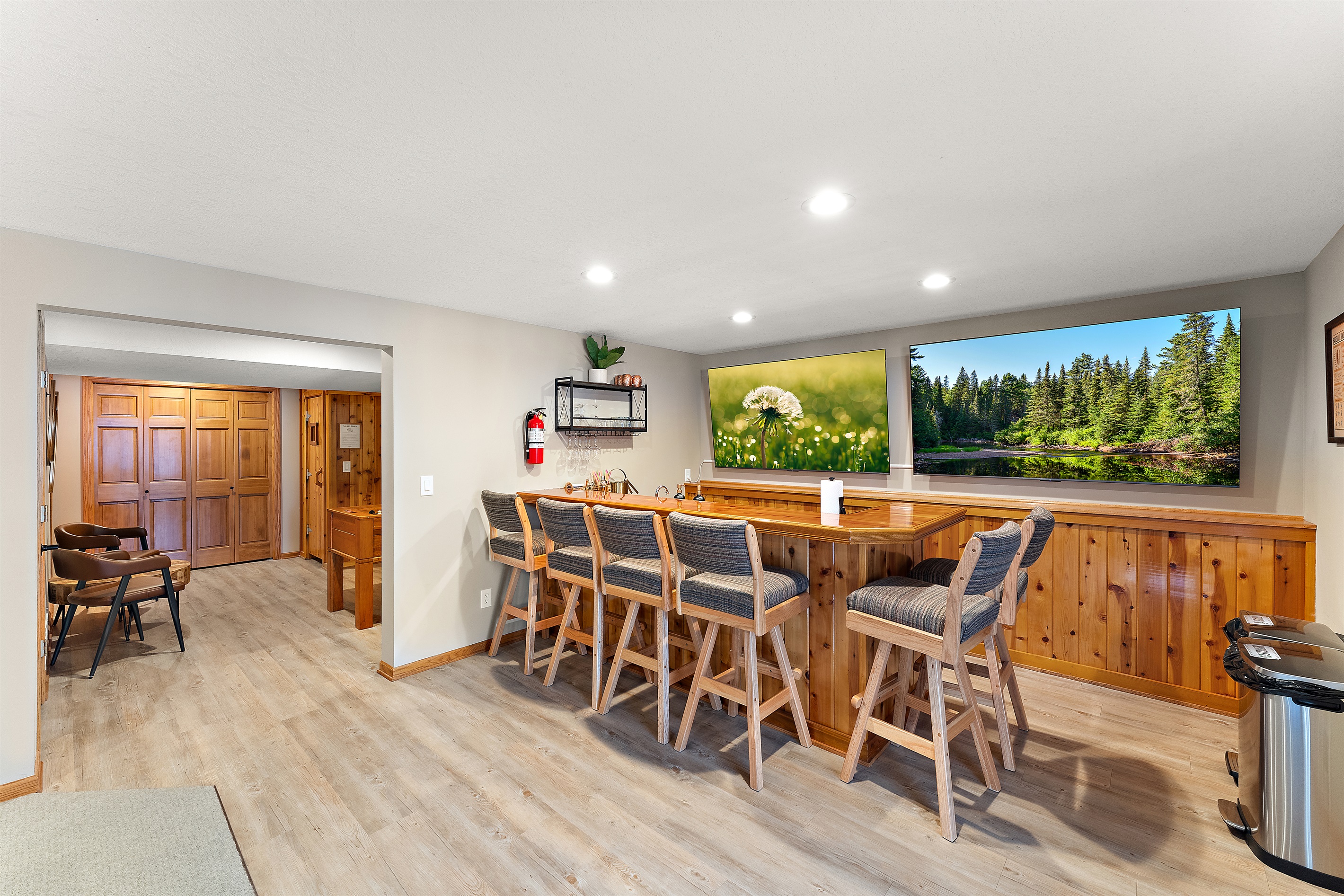 Sleeps up to 14 with room to spread out and relax. The entertainment basement is a highlight, featuring two 75″ TVs, arcade machine, foosball, sauna, and a private hot tub.